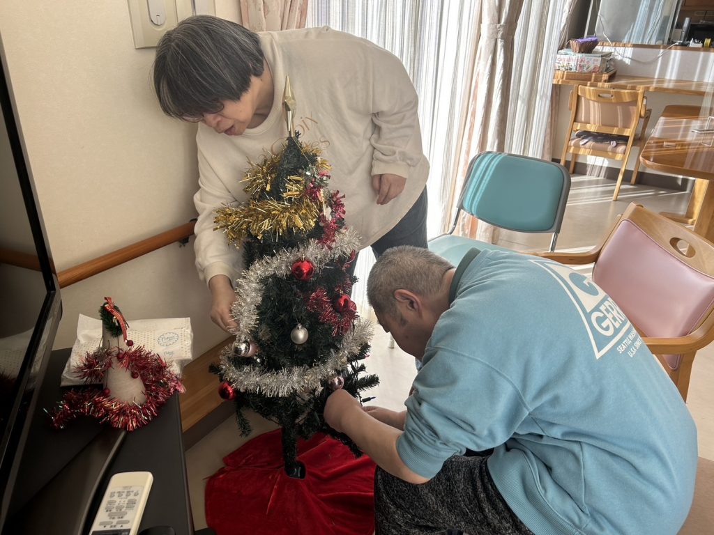 利用者さんと一緒にクリスマスツリーの飾りつけをしました🎄