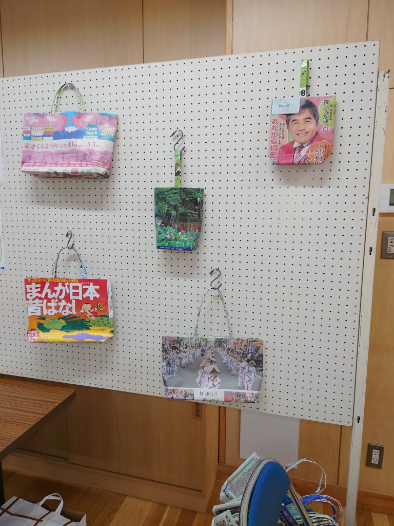 これ、ゆらカフェに通っている住民がつくったものです(ごく一部)。一度ゆらカフェで新聞紙を使ったエコバック作成をしたところ、それから自宅でたくさんつくられるようになりました。つくったら私たちにくれるんです。